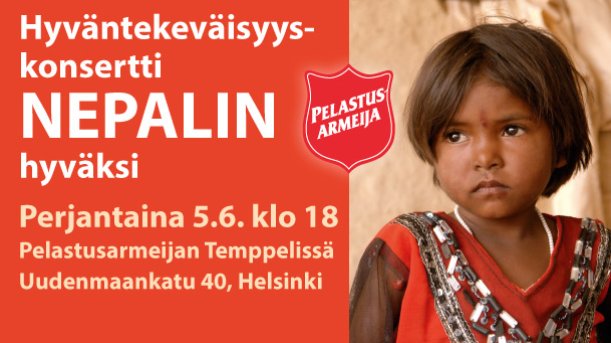Hyväntekeväisyyskonsertti Nepalin hyväksi Perjantaina 5.6. klo 18 Pelastusarmeijan Temppelissä