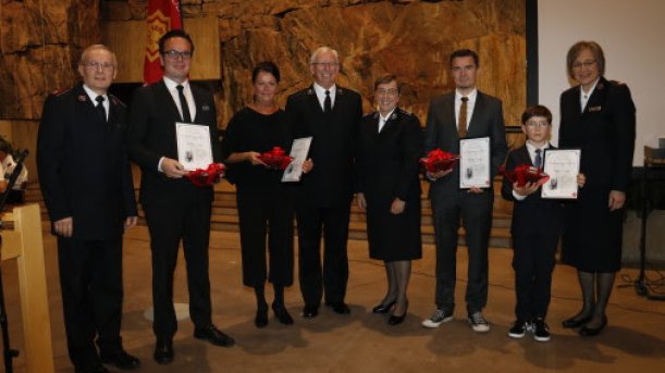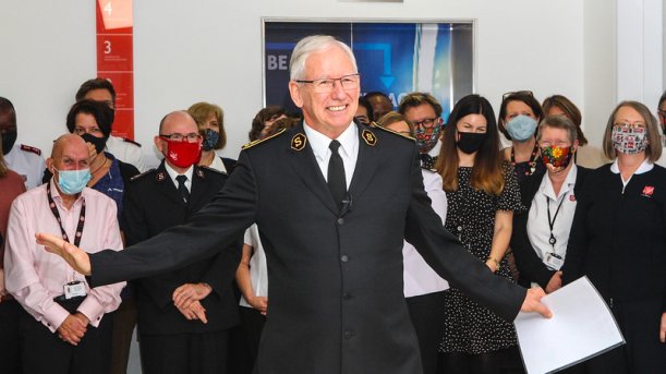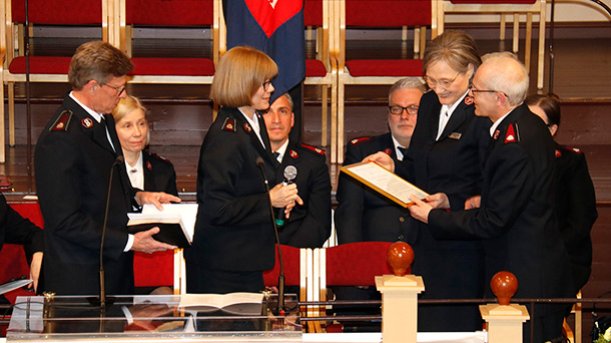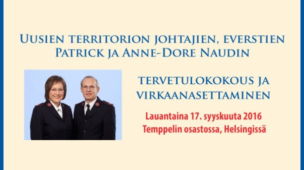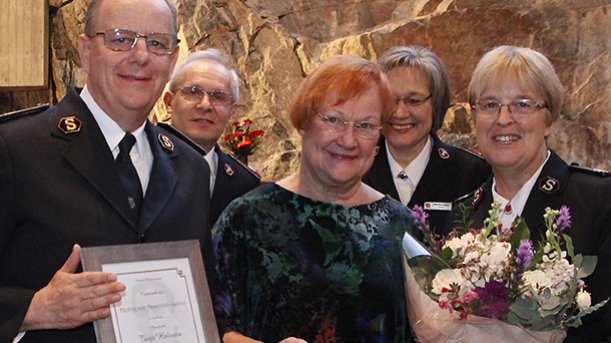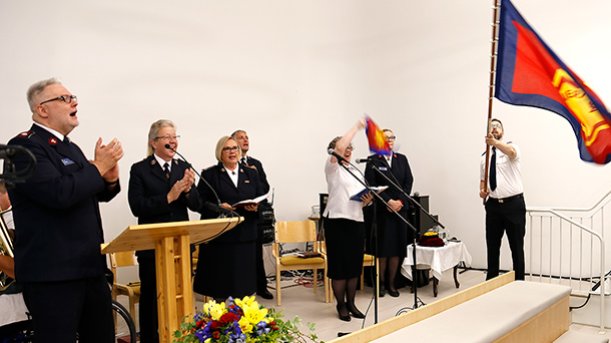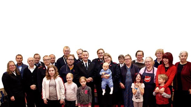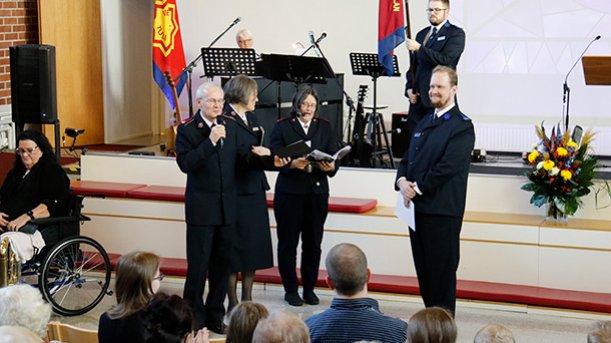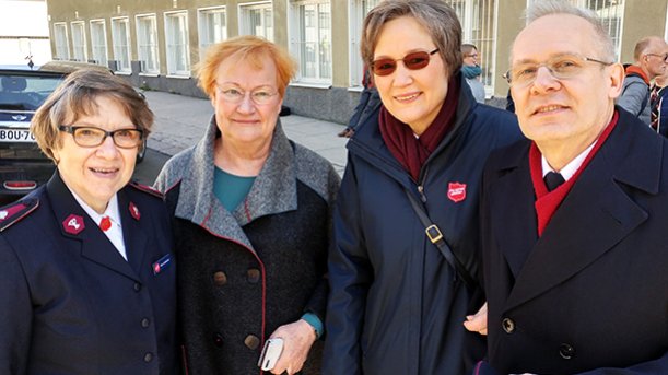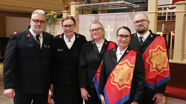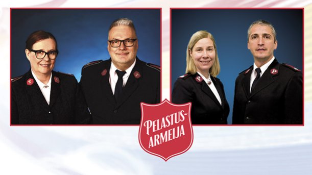 Pelastusarmeijan Suomen ja Viron territorion aiemmat johtajat, komentajat Carl ja Gudrun Lydholm, komentajat Dick ja Vibeke Krommenhoek, komentajat Johnny ja Eva Kleman ja everstit Patrick ja Anne-Dore Naud tervehtivät lämmöllä 135-vuotiasta Pelastusarmeijaa Suomessa.