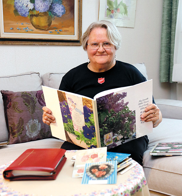 – Ennen vanhaan sellaisia kortteja oli paljon. Brasiliassa jopa lehtikioskeista sai niitä. Minun oli pakko alkaa itse askartelemaan näitä, ja nykyisin useimmiten liimaan kunkin raamatunlauseen siihen sopivaan korttiin. Kortteja minulla on runsaasti, olen saanut niitä äidiltäni ja ostanut kirpputoreilta. Ennen koronaa Helsingin osastolla oli myös myyjäiset, ja sieltä sai ilmaiseksi ottaa kortteja.