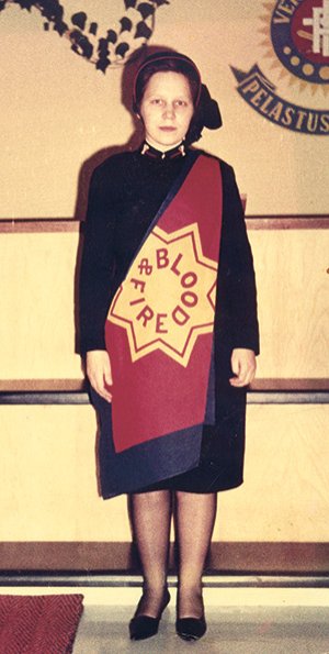 – Opiskelin tuohon aikaan iltakoulussa Helsingissä. Olin Lauttasaaren jäällä hiihtämässä, kun Jumalalta tuli kehotus, että mene Helsingin IV osastoon. Ajattelin, etten voi, koska olin hiihtopuvussa. Mutta Jumala määräsi, että on mentävä! Kävelin sinne sukset olallani, jätin ne oven viereen ja menin sisälle. Sisällä alttari oli verhottu valkoisella, liput oli koristeltu nauhoin ja ihmisillä oli käsissä valkeat nauhat. Se oli muistotilaisuus, ymmärsin myöhemmin. Piilouduin tolpan taakse ja lauloin mukana. Yhtäkkiä puhuja sanoi: ”Pelastusarmeija on kuin muuri, ja nyt on yksi tiilistä lähtenyt. Tiedän, että täällä on henkilö, jonka täytyy täyttää se.” Olin ihmeissäni, sillä en ollut kellekään puhunut ajatuksistani. Päätöslaulun jälkeen minua yritettiin saada kolmesti alttaripenkille, mutta kieltäydyin, kunnes puhuja, majuri Moisio tuli luokseni ja sanoi: ”Neiti, eikö teidän pitäisi mennä rukoilemaan?” Näytin punaisia hiihtohousujani. Hän asetti kätensä olkapäälleni ja sanoi: ”Neiti, kummalla te rukoilette – housuilla vai sydämellä?” En voinut enää kieltäytyä. Myönsin, että Herra kutsui minua.