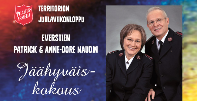 Everstien Patrick ja Anne-Dore Naudin jäähyväiskokous pidetään lauantaina 13.5. klo 14 Pelastusarmeijan Temppelissä, Helsingissä – ja olette sinne kaikki lämpimästi tervetulleita.