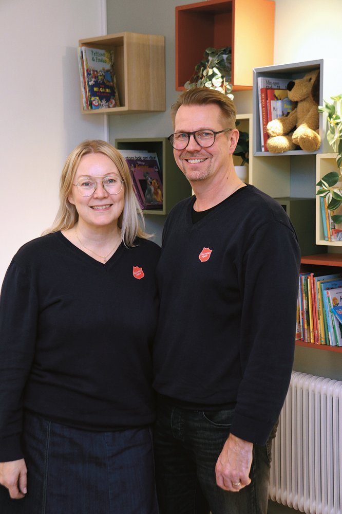 Saavun osastolle, jossa on kohta alkamassa ”Goda Nyheter” (Hyviä uutisia) -hartaushetki. Väki on saapunut jo hyvissä ajoin, ja pöytäseurueista kuuluu iloinen puheensorina. Osaston johtajat, luutnantit Pasi ja Marjo Maikkunen tulevat tervehtimään. Hetken ennen hartautta käytän katselemalla ympärilleni. Osaston tilat hehkuvat kodikkuutta: intiimi sali, raikas lasten huone ja viihtyisä kahvittelutila.