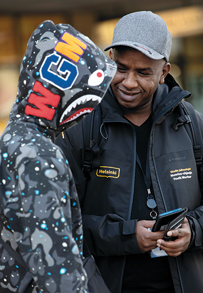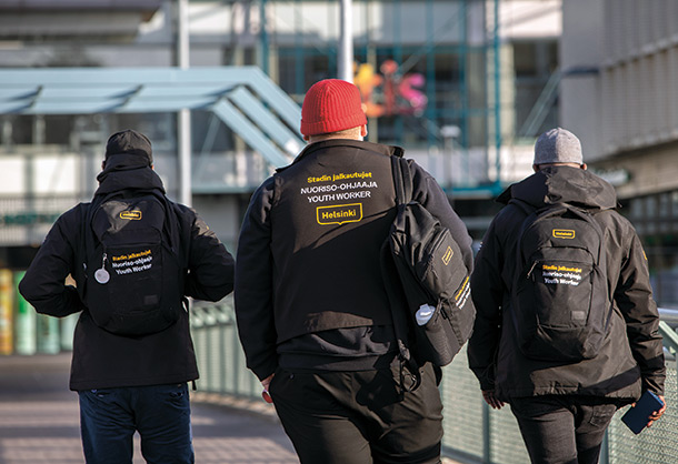 – Kuljemme työvaatteissa ja olemme nuorten tavoitettavissa. Yksinkertaisuudessaan kohtaaminen menee esimerkiksi niin, että kun näemme kauppakeskuksessa ryhmän nuoria, menemme moikkaamaan heitä. Jos tulee juttua, niin jutellaan, jos ei, niin jatkamme matkaa. Seuraavan kerran kun näemme samat nuoret, olemme tulleet jo tutuiksi heille. Pitkällä aikavälillä luodaan tarttumapinta, että meille voi tulla juttelemaan.