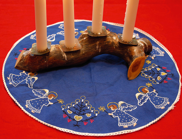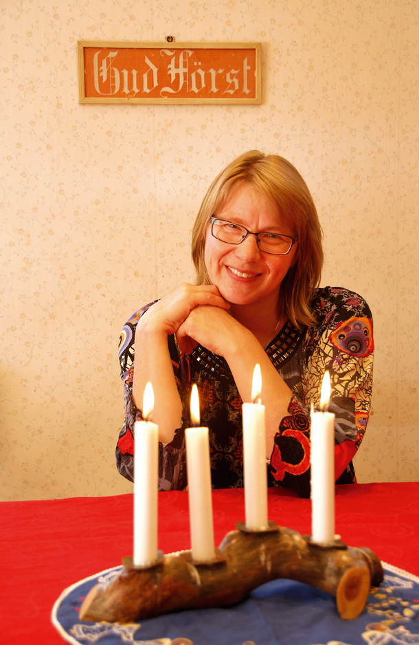 Siirrymme keittiön puolelle istumaan kahvikupposten äärelle. Pöydällä hehkuvat kynttilät puisessa kynttilänjalassa. Kynttilänjalan on tehnyt Katin tädin mies Viljo Seliverstov. Kynttilänjalka on Katille rakas:
