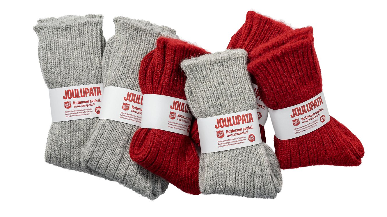 Helsingin Villasukkatehdas lahjoittaa jokaisesta sukkaparista 6,99 € Joulupata-keräykseen. Joulupadan keräystuotoilla autetaan kotimaan vähävaraisia perheitä, yksinäisiä vanhuksia, syrjäytymisvaarassa olevia nuoria ja muita ahdinkoon joutuneita.