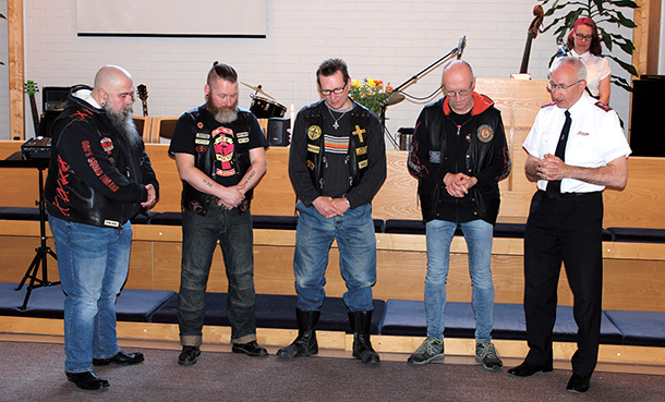 Osastossa on jumalanpalvelus joka sunnuntai, mutta tämä päivä on hiukan epätavallinen. On myös tärkeää, että jumalanpalvelus pidetään Pelastusarmeijan tavallisen tavan mukaan siten, että kaikki voivat tuntea olevansa tervetulleita. Kokous alkaa tervetulotoivotuksella, ja Cedric Hillsin pianosäestyksellä laulamme laulun De kommer från öst och väst. God’s Squadin Rolf Pajukangas aloittaa raamatunluvulla ja rukouksella. Sitten saamme kuulla God’s Squadista ja siitä, mitä he tekevät teillä moottoripyöräilijöiden parissa. Osaston johtaja, kapteeni Geir Sødal jatkaa kertomalla Pelastusarmeijan moottoripyöräilijöiden parissa tekemästä työstä Norjassa (The Salvation Army Motorcycle Ministry Nomad). Saamme myös kuulla Cedric Hillsin kiinnostuksesta moottoripyöriin sekä Geir Sødalin kokemuksista moottoripyöräpiireissä ja tien päällä.