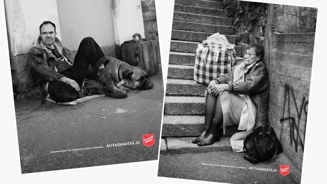 Pelastusarmeijan pysäyttävissä kuvissa Tarja Halonen ja Peter Vesterbacka poseeraavat alakuloisissa mustavalkoisissa otoksissa ihmisinä, joita on kohdannut odottamaton huono onni. Kuvattavat ovat lähteneet mukaan muistuttaakseen ihmisiä elämän sattumanvaraisuudesta.