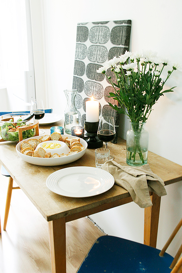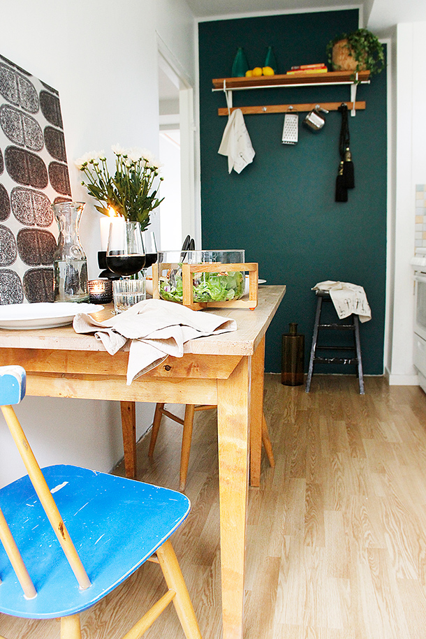 Miten mahtavalta tuntuukaan kantaa vaivalla työstettyyn tilaan muutamat tarkkaan harkitut astiat ja somisteet! Ensimmäisen kattauksen myötä keittiö herää eloon.