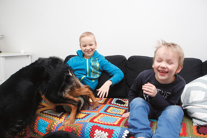 Lucas keskittyy pikkuveljen Noelin kanssa tabletissa meneillään olevaan peliin, ja juttelemme perheen äidin, Tarun, kanssa kahvikupin äärellä hetkisen. Olen kiinnostunut tietämään, mitä Nummelan lomakoti tarjoaa perheen aikuisten näkökulmasta. Perheen suloinen koira Nala on sitäkin kiinnostuneempi pöydällä olevista muffineista.