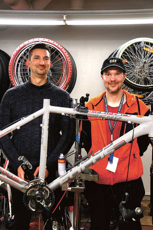 – Kuntouttavassa työtoiminnassa aloitin siivoustehtävissä, mutta sitten pääsin tänne pyöräpajalle. Täällä oli nyt jo eläköitynyt talonmies Taisto, joka tiesi fillareista tosi paljon, hän opasti minua alkuun. Opin pyöränkorjaamisen alkeet.