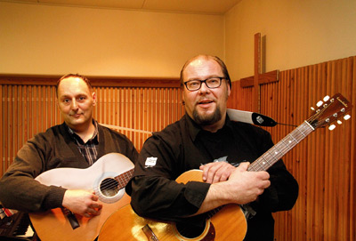 Salin lavalta kuuluu musiikkia, Jukka Saano ja Mika Erling tekevät sormiharjoituksia illan musiikillista osuutta varten.