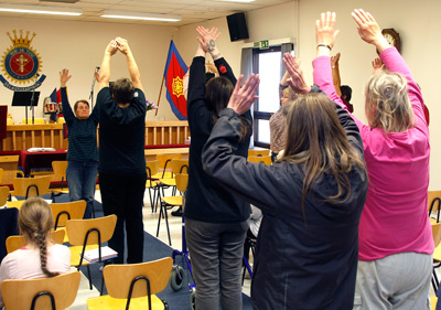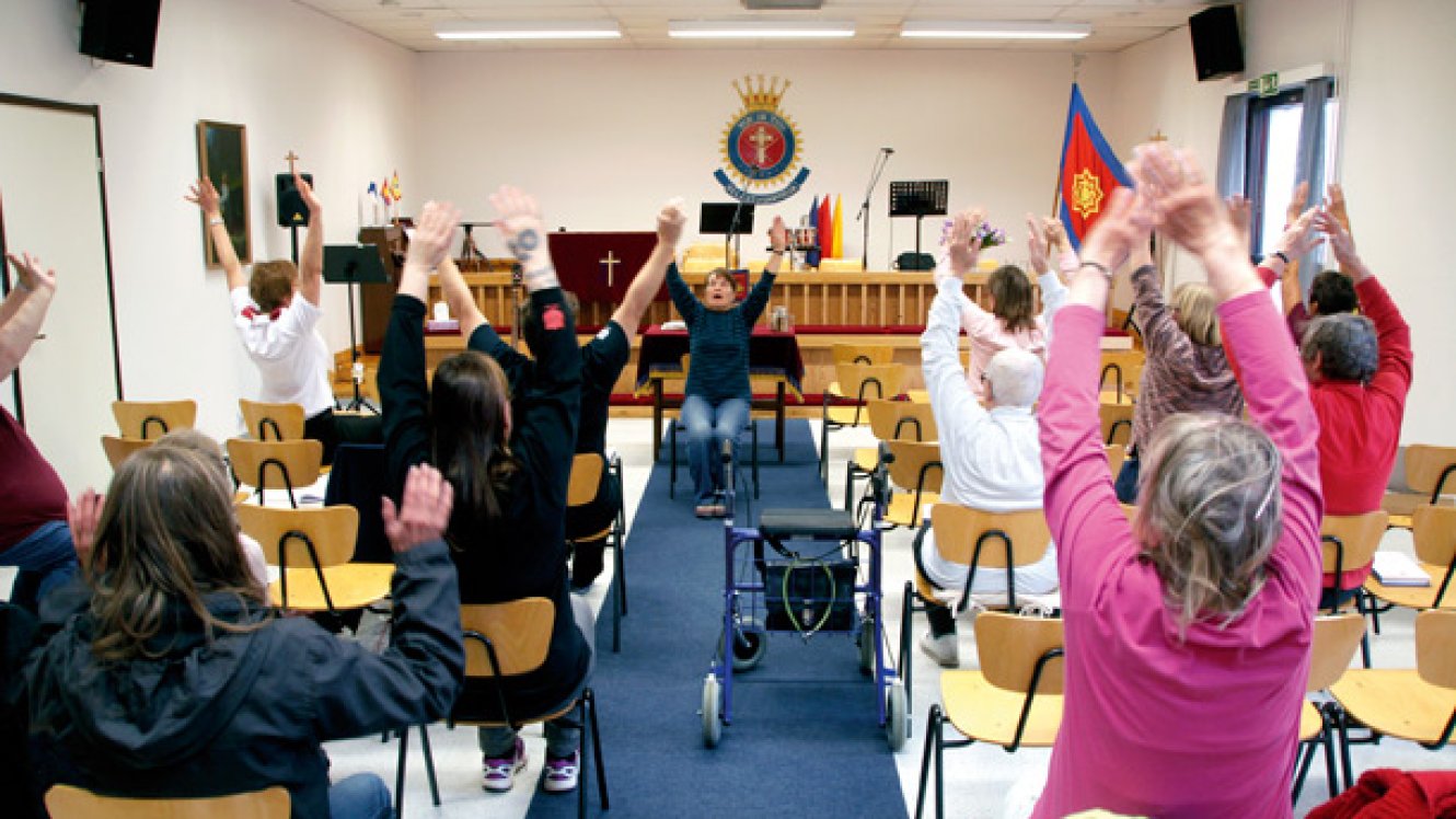– Rakastan liikuntaa. Jos pitää itsestään huolta hengellisesti, niin vastapainona pitää olla ruumiillista hyvää. Tällaista liikunnallista kokoontumista ei monessa Pelastusarmeijan osastossa olekaan! Ja meillä on niin hauskaa! Täällä saa nauraa ja kommentoida. Liikunnan ihmisenä olen joskus ajatellut, ettei olisi ollenkaan pahitteeksi, jos sunnuntain jumalanpalveluksessakin olisi pieni jumppahetki. Niin vanhaa ei ole, ettei jumpata voisi. Kaikki liikkumaan! Eira naurahtaa.