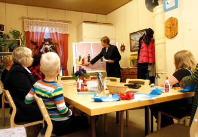 Rauman osastolla lapset otetaan huomioon – kahden vuoden ajan lapsille on järjestetty oma pyhäkoulu. Siirryn Tuulan ja lasten kanssa pyhäkoulun puolelle. Aluksi Tuula vie meidät Esterin raamatunkertomuksen äärelle. Lapset kuuntelevat tarkkaavaisina. Tarinan jälkeen vuorossa on askarteluhetki. Siviilijäsen Laila Riiskin johdolla lapset askartelevat näin pimeälle ajalle jotain hyvin tärkeää – heijastimet! Punaiset huopasydämet saavat koristuksekseen hehkuvia poroja, enkeleitä ja tähtiä lasten taitavissa käsissä.