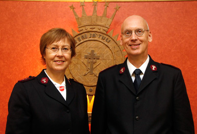 Sali on tyhjentynyt ja valot sammutettu. Illan päätteeksi tutustumme osastonjohtajiin, kapteeneihin Seppo ja Tuula Takalaan. Heidän yhteinen polkunsa alkoi 21 vuotta sitten Tampereen työväenopiston englannin kurssilla ja on johdattanut heidät Pelastusarmeijaan ja tähän päivään.