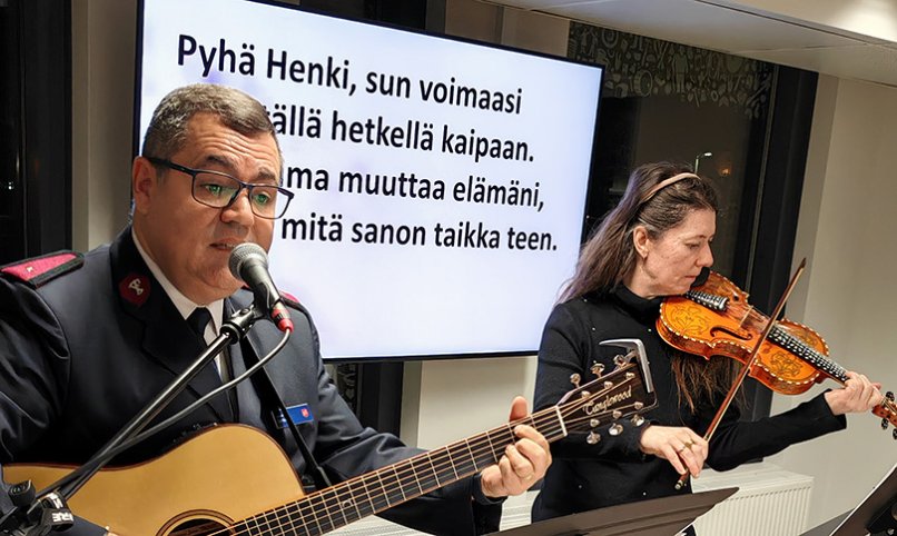 Ilta päättyi kahteen hienoon musiikkiesitykseen. Vuosaaren musiikkiopiston nuoret viulunsoittajat esittivät puolituntisen sikermän musiikkia, ja lopuksi Eliel Vargas ja viulisti Meri-Sofia Lakopoulos lauloivat ja soittivat lauluja Pelastusarmeijan laulukirjasta.