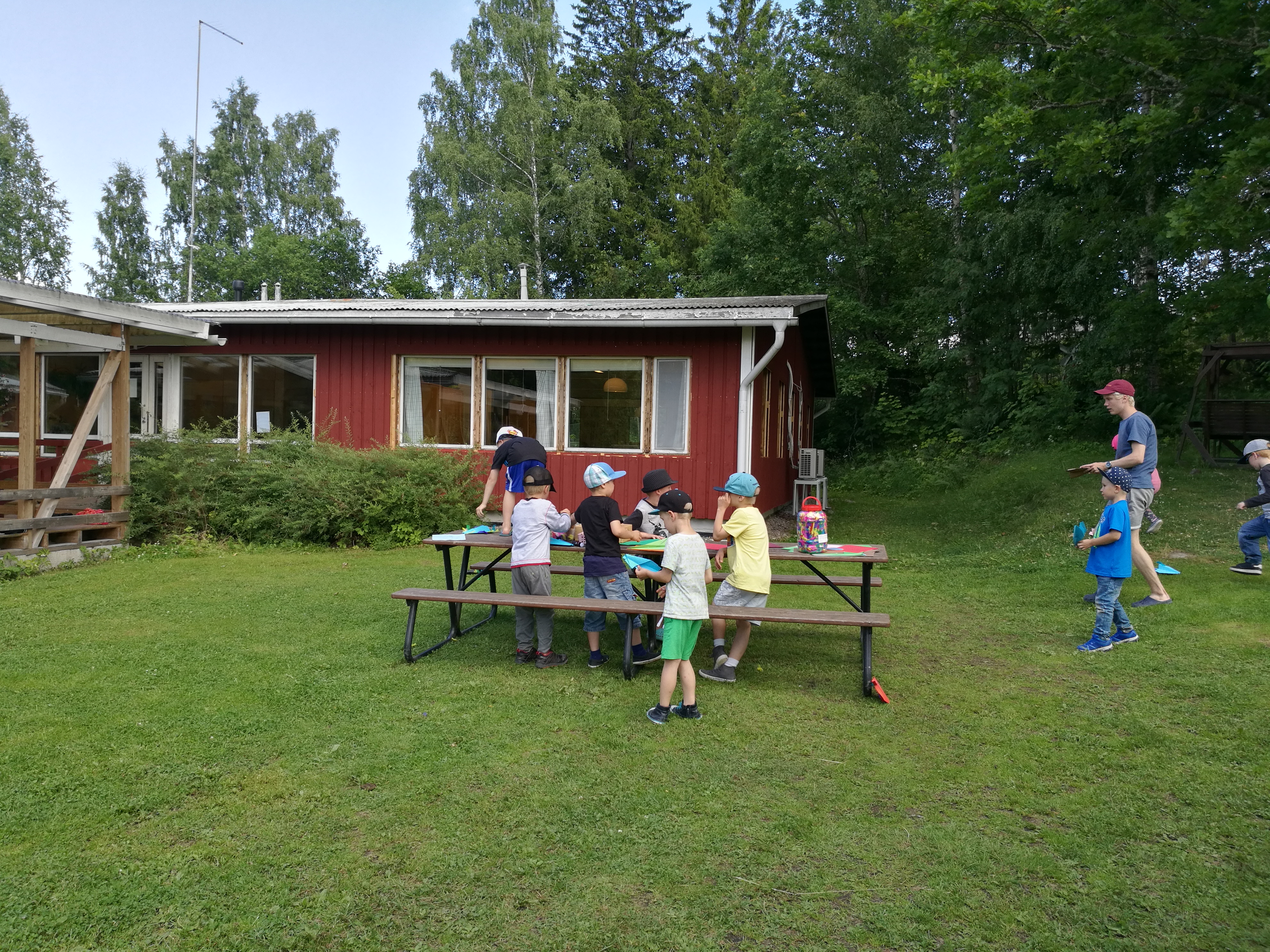 Kuva 2. Pojat askartelevat lennokkeja pihalla.