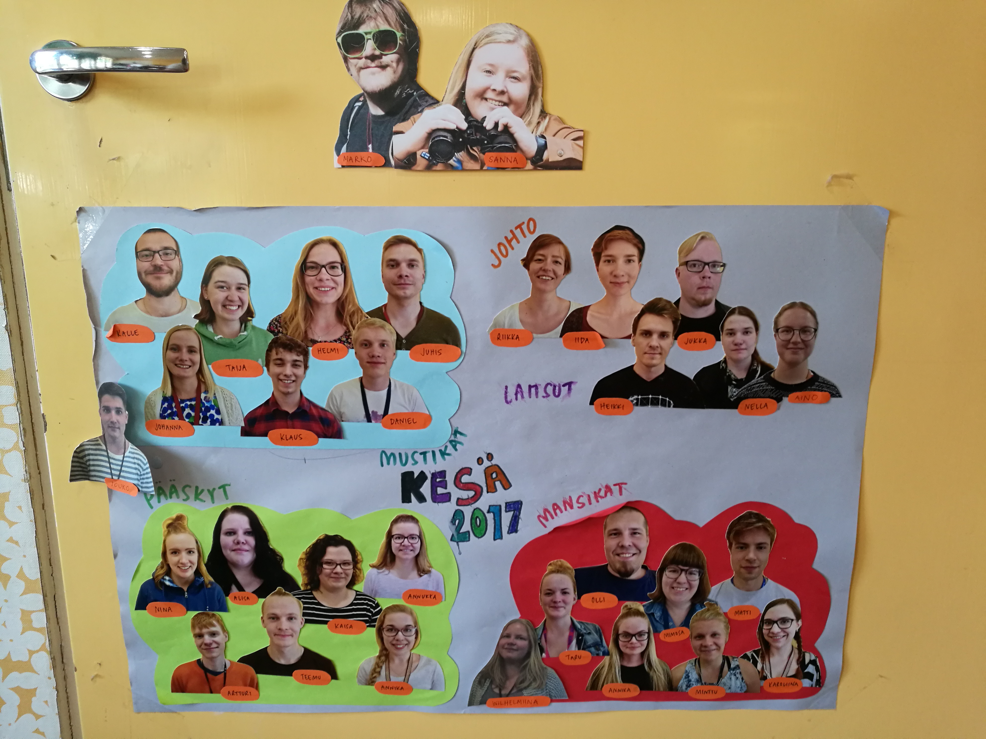 Kuva 3. Kesäleirin henkilökunta. Lapset ja heidän ohjaajansa on jaoteltu kolmeen eri ryhmään: Pääskyissä ovat nuorimmat lapset, Mansikoissa vanhemmat tytöt ja Mustikoissa vanhemmat pojat.