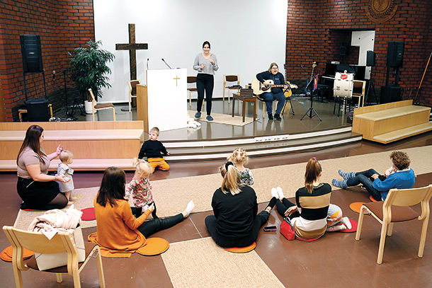 Kaisu antaa merkin, että nyt on meidänkin aika siirtyä salin puolelle. Äidit ja lapset istuvat puoliringissä lattialla. Kaisu ottaa kitaran ja johdattaa ryhmän lauluun. Viivi näyttää mallia laululeikistä. Lapsista osa on täysillä mukana, toiset hiukan vähemmän… mutta sekä lapset että äidit hymyilevät, ja salista henkii rauhallinen ja iloinen ilmapiiri. Muutaman laulun jälkeen on aika nauttia välipalaa kahvilan puolella.