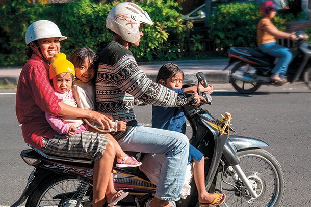 Indonesia on väkiluvultaan maailman neljänneksi suurin valtio. Mihin tahansa kaupunkiin satutkaan, kaikki tuntuvat ajavan moottoripyörällä. Vuoden 2019 tilastojen mukaan täällä oli käytössä noin 107 miljoonaa moottoripyörää – valtava määrä 275 miljoonan väkilukuun nähden. Auto on keskituloiselle perheelle liian kallis hankinta, mutta moottoripyörän omistaminen on monille saavutettavissa oleva unelma. Pyörät eivät ole harrastus – ne ovat useimmille tärkeitä kulkuvälineitä, luotettavia ”työjuhtia”. Ne ovat perheen kulkuneuvo, kuljetusajoneuvo, liikkuva kauppa ja paljon muuta. Ne ovat suoritusteholtaan pieniä, yleensä 100–150 cc, ja ne tunnetaan ”hyttysinä”, koska ne surraavat ympäri kaupunkia ja saartavat nelipyöräiset ajoneuvot. On hyvin tavallista nähdä nelihenkinen perhe 100cc:n skootterin kyydissä: taapero seisoo edessä, isä ajaa, ja äiti istuu takana vauva tai pikkulapsi vanhempien väliin tungettuna.