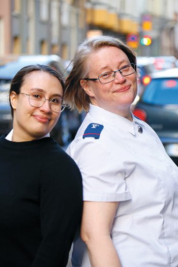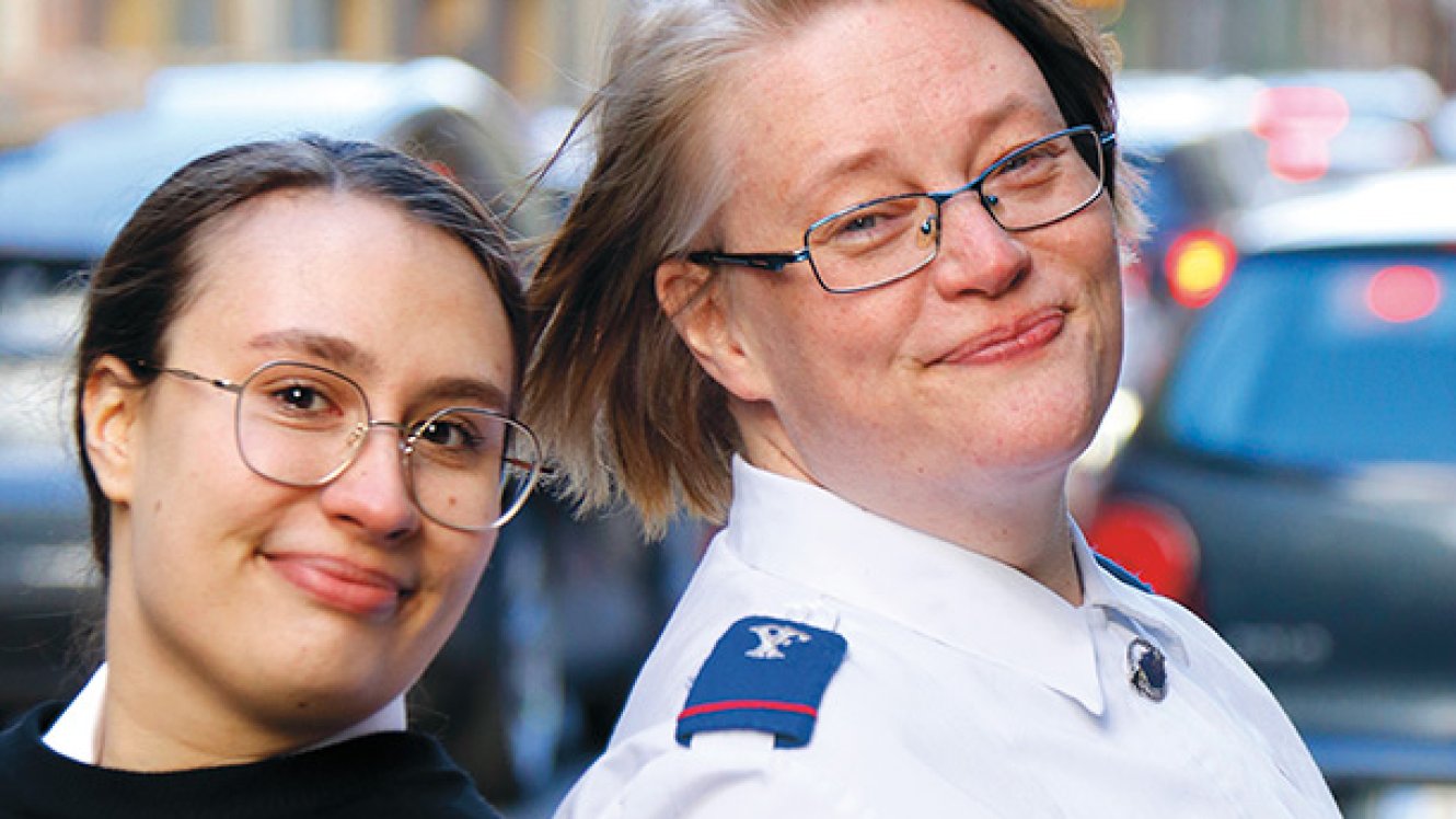 Kadetit Enni Becker ja Taina Kaikkonen ovat upseerikoulun lähiopetuspäivillä päämajassa. He ovat nyt toisen vuoden kadetteja, joten opintoja on takana reilu vuosi. Enni toimii Salon osaston johtajana yhdessä miehensä, kadetti Robert Beckerin kanssa, ja Taina puolestaan toimi haastatteluhetkellä Kouvolan osaston avustajana. Syyskuun alusta Taina on toiminut Lahden osaston avustajana. Heille molemmille Pelastusarmeija ja sen naistyö on tuttu jo vuosien takaa.