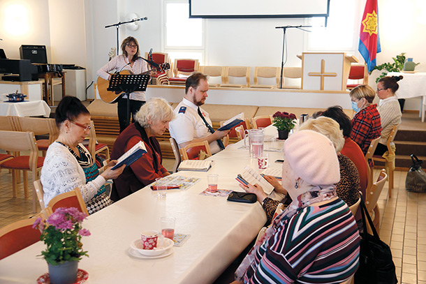 Aamun musiikkipuolessa on auttamassa Sirkka Lankinen kitaran kanssa. Hän nauttii yhteiskristillisistä toiminnoista ja on välillä Armeijan tilaisuuksissa mukana. – Uskovien yhteys virkistää.