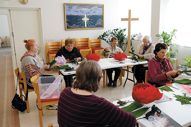 Normaalisti joka toinen tiistai pidetään naisten kahvi- ja keskustelupiiri, mutta aina välillä naiset kokoontuvat tekemään käsitöitä. Tällä kerralla on juuri näin: työn alla ovat hienot, suurikokoiset ruususomisteet kevätjuhlaa varten. Aikaisemmin on myös Aven johdolla askarreltu pintakoristeltuja onnittelukortteja, joilla on kerätty osastolle varoja.