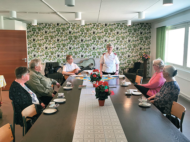Seuraavaksi olen lähdössä kaksille treffeille. Kyseessä ovat Helsingin ruotsinkielisen Temppelin osaston torstaitreffit (Torsdagsträffen) ja Sipoon tiistaitreffit (Tisdagsträffen). Torstaitreffit pidetään Pelastusarmeijan Temppelin ja päämajan yhteisissä kahvitiloissa. Tällä kertaa treffeille on saapunut reilut kymmenen osaston aktiivista eläkeläisjäsentä.