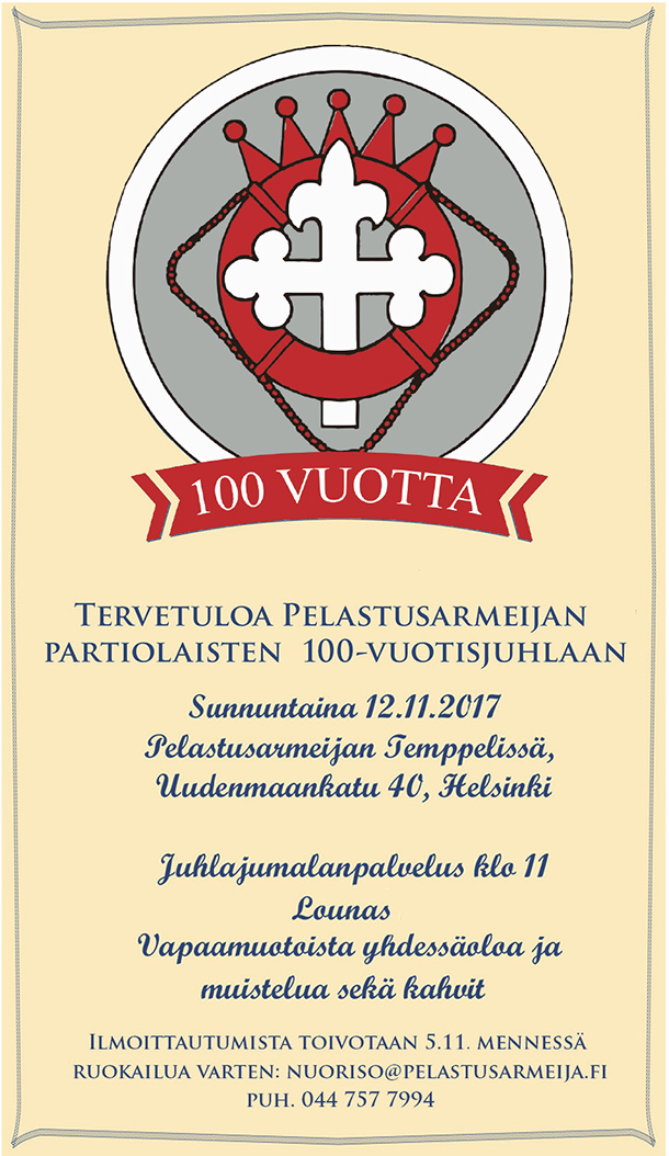 Tänä vuonna Suomi täyttää sata vuotta, eikä ole ainoa senikäinen. Samana vuonna Pelastusarmeijan partiolaiset aloitti toimintansa maassamme. Keväällä 1917 niin kutsutut Suojeluspojat kokoontuivat ensimmäistä kertaa Temppelin pihalle Uudenmaankatu 40:ssä Helsingissä.