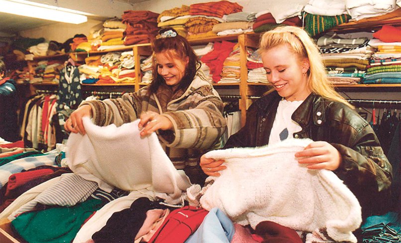 Suomessa Pelastusarmeija sai ensikosketuksen kierrätystoimintaan jo sotien jälkeen. Ihmisten auttamisen halu oli suurta, ja Armeija sai paljon vaatteita lahjoituksena. Osa laitettiin myyntiin, ja näin saaduilla tuloilla pystyttiin tukemaan Suomen köyhiä monipuolisemmin. 1960-luvulla Suomeen perustettiin kaksi kirpputorimyymälöiden ketjua: Pelastusarmeijan kirpputorit ja Emmaus. Kuvassa tyttöjä Pelastusarmeijan kirppiksellä 80-luvulla.