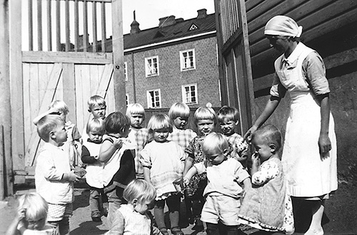 Pelastusarmeijan päiväkodeilla on Suomessa melkein yhtä pitkä historia kuin Pelastusarmeijalla itsellään. Tämä sosiaalisen työn muoto alkoi vuonna 1894, kun Pelastusarmeija perusti ensimmäisen lastenseimen Helsinkiin. Seimi toimi Pursimiehenkadulla sijainneen slummiaseman yhteydessä, ja lastenhoitajina toimivat slummisisaret. Seimi mahdollisti työelämän ja perheen yhteensovittamisen äideille, joiden täytyi käydä töissä. Kuvassa lastenseimen pienokaiset hoitotädin kanssa pihalla 1930-luvulla.