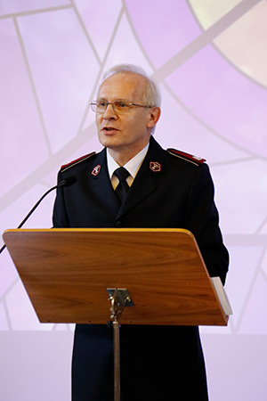 Majuri Esa Nenonen lukee Raamatusta Toisesta kirjeestä korinttilaisille 5:14–21. Saarnassaan eversti Patrick Naud muistuttaa, että uuden luutnantin kadettirenkaan nimi on Sovituksen lähetit. Sovitus ei ole koskaan ollut helppoa, ja näinä vaikeina aikoina sovitusta tarvitaan enemmän kuin koskaan.