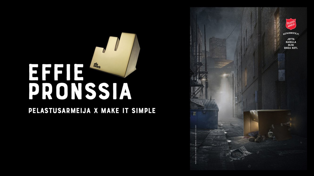 Pelastusarmeijan Auta ihmistä -kampanja Ulkona – Jotta kaikilla olisi oikea koti on voittanut pronssisen Effie Awards -palkinnon.