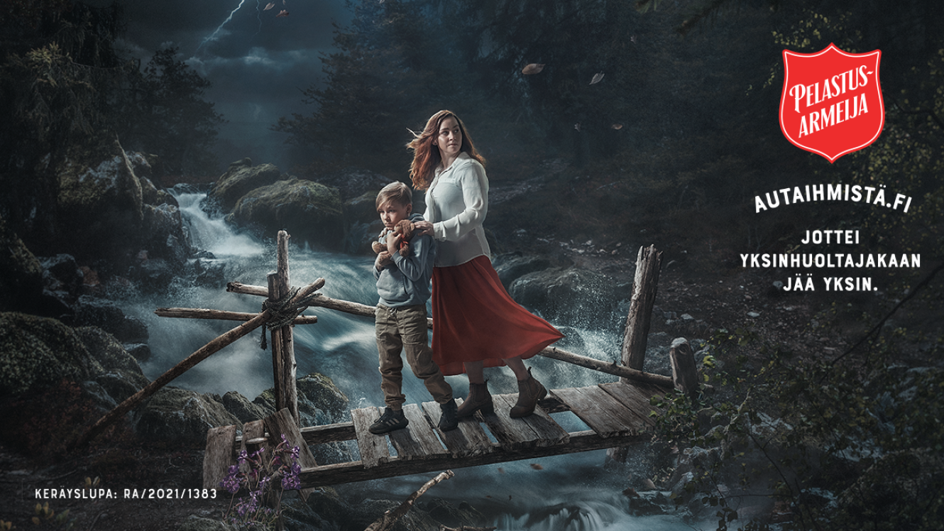 Pastissi Suojelusenkeli-taulusta on tuttu vuoden takaisesta kampanjasta. Sen on suunnitellut mainostoimisto Make it Simple , ja toteuttanut valokuvaaja Onni Wiljami Kinnunen . Kuva visualisoi sen, kuinka moni yksinhuolta joutuu usein tasapainoilemaan saattaessaan lapsiaan liukkaan sillan yli.