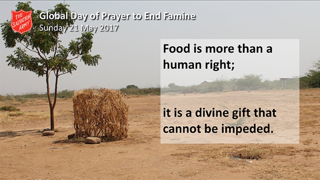Kuivuuden koetellessa Afrikan mannerta Pelastusarmeija sekä tekee käytännön työtä että kutsuu Armeijan jäseniä ja ystäviä osallistumaan maailmanlaajuiseen rukouspäivään nälänhädän poistamiseksi maailmasta. Sunnuntaina 21.5.2017 tapahtuman tukena ovat monet kirkot ja ryhmät mukaan lukien World Vision, Kirkkojen maailmanneuvosto ja Maailman evankelinen allianssi.