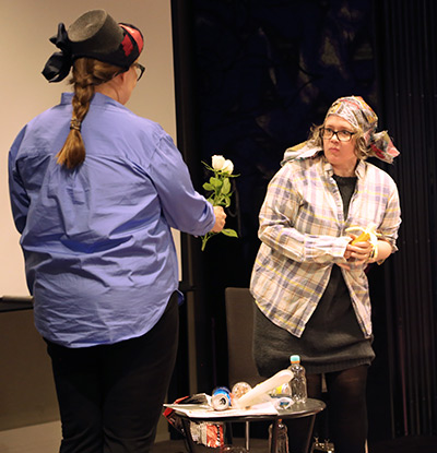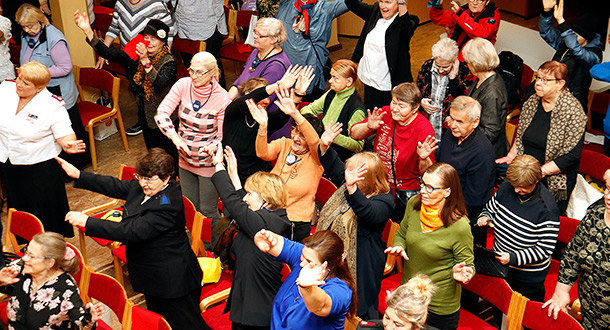 Kokous käynnistyi riemukkaasti kapteeni Anneli Aavikin johtaman tamburiiniryhmän esityksellä. Myös yleisö pääsi vetreyttämään lihaksiaan, kun kapteeni Tuula Takala ja kadetit Enni Becker ja Taina Kaikkonen johdattivat psalmin 100 äärelle psalmin sanoja mukailevin reippain liikkein.