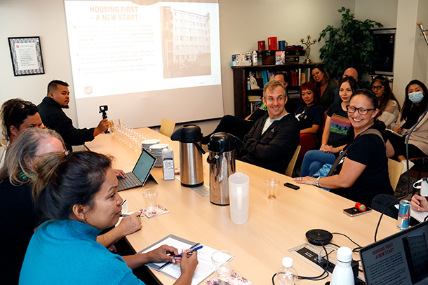 Herra Bridges työskentelee rahoituspuolella ja on mukana useamman hyväntekeväisyysjärjestön asunnottomuusprojektien hallituksissa. – Asunnottomuus on akuutti ongelma Havaijilla, ja tahtoisimme oppia hyvästä työstä, jota täällä on tehty. Herra Barnum Havaijin budjetti- ja politiikan keskuksesta jatkoi: – Pohdimme erilaisia asunnottomuusratkaisuja. Puhumme paljon Asunto ensin -mallista, mutta sitä ei ole kuitenkaan laajasti toteutettu. Tarvittaviin investointeihin ei ole panostettu. Olemme siis hyvin uteliaita kuulemaan, miten olette saaneet tämän toimimaan.