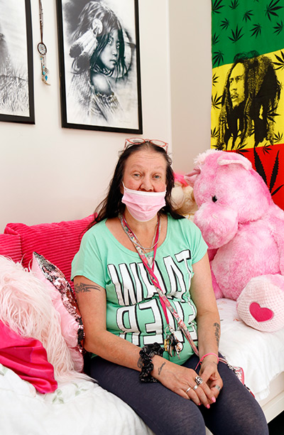 – Olen asunut täällä neljä vuotta ja viihtynyt todella hyvin. Kuntouttavassa työtoiminnassa olen mukana melkein päivittäin. Aiemmin olin paljon keittiössä, mutta nyt tykkään työskennellä siivoustehtävissä, Tuija kertoi hymyillen sängyllä istuen, suuri pinkki nalle vierellään.