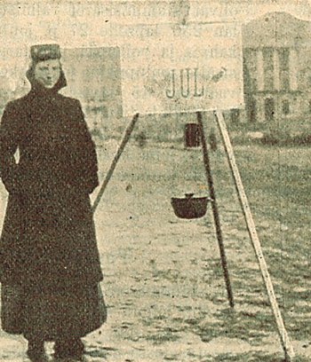 Se ensimmäinen joka laskin lantin pataan, oli yksi poliisiviranomaisista. Erääseen toiseen pani ensimmäisen ”lyhteen” pieni sanomalehti poika. Hyvin tehty, pieni ystävä! – Ja sitten se alkoi oikein totuudessa. Nuoret ja vanhat, rikkaat ja köyhät – kaikki tahtoivat antaa.