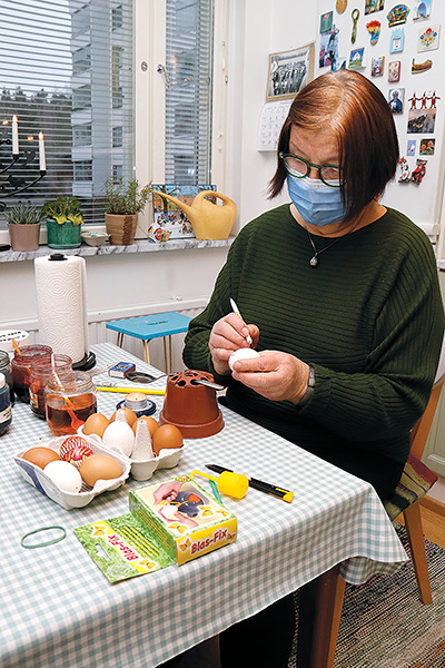 – Maalaus ja siihen liittyvät toiminnot hiukan haittaavat muita perinteitä, Ritva naurahtaa. – Mielestäni on tärkeää, että juhlat erottuvat arjesta. Toisena pääsiäispäivänä kutsun aina perheen syömään ja käyn joissain kirkkotilaisuudessa, kuten konsertissa tai katsomassa kärsimysnäytelmää. En paastoa, mutta koen, että kaikista päättömyyksistä voi aina karsia. Pääsiäinen on hyvää aikaa pohtia omaa elämää ja muistella sitä pääsiäisen olennaisinta sanomaa – Kristus on ylösnoussut ja uusi elämä on meille tarjottu.