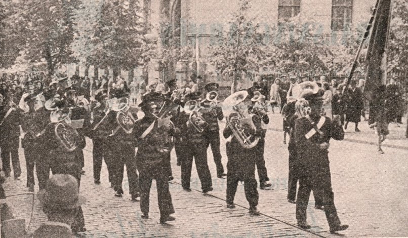 Sotahuudon kirjoittaja luo kuvaa ikimuistoisesta maanantai-illasta Temppelissä. Sali on täynnä ja öljylamput levittävät himmeää hehkua. Iltakahdeksalta lava täyttyi eri soittimista. Tiedämme, että juhlassa käytettiin yhteensä 65 soitinta. Suomen Pelastusarmeijan perustaja Hedvig von Haartman piti juhlassa saarnan. Ensimmäistä soittokuntaa johti pelastusupseeri Alfred Henriks son , joka oli määrätty kouluttamaan joukko nuoria torvensoittotaitoon. Suomen ensimmäinen miespuolinen pelastussotilas Johan Sandborg soitti bassorumpua.