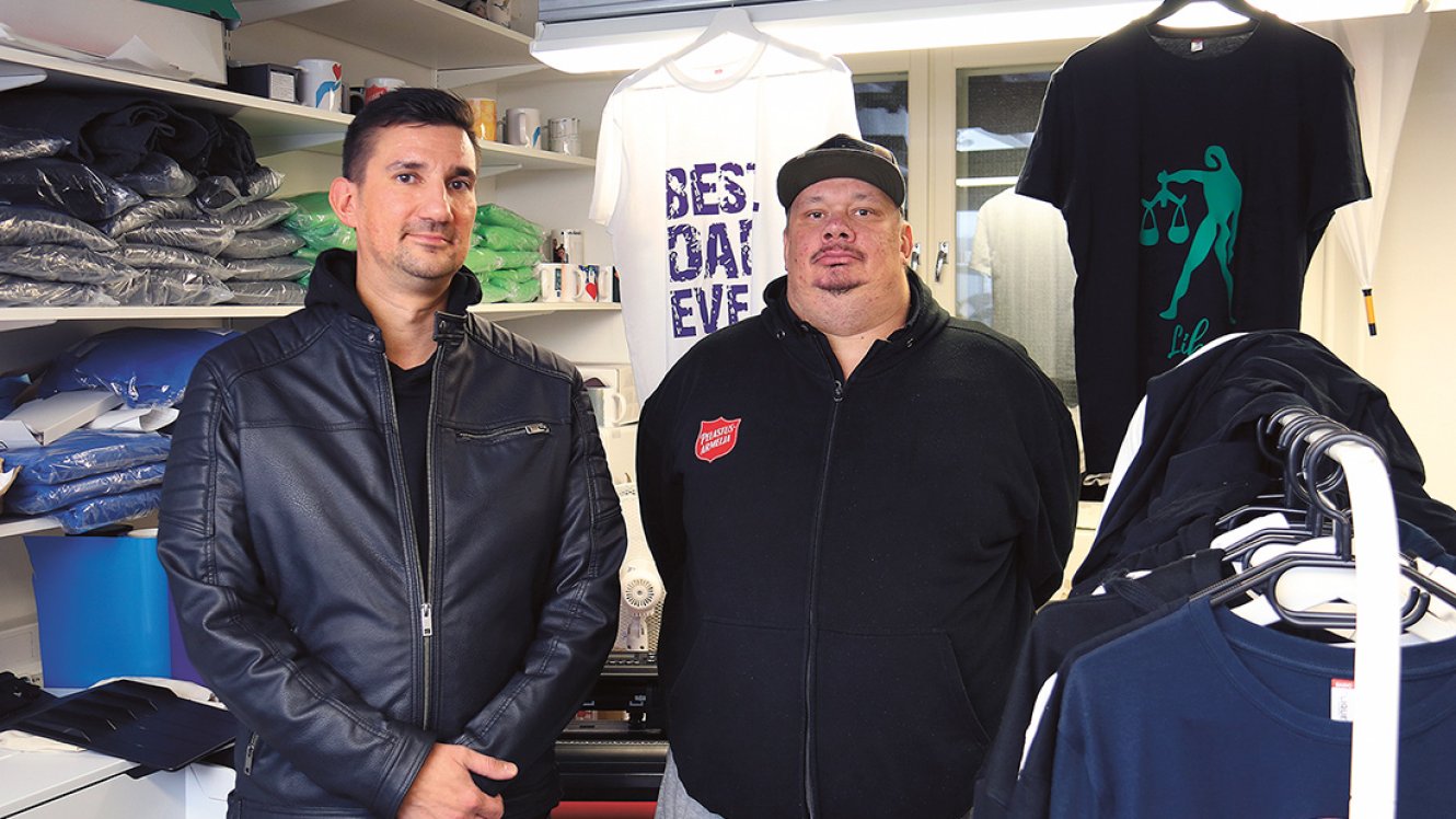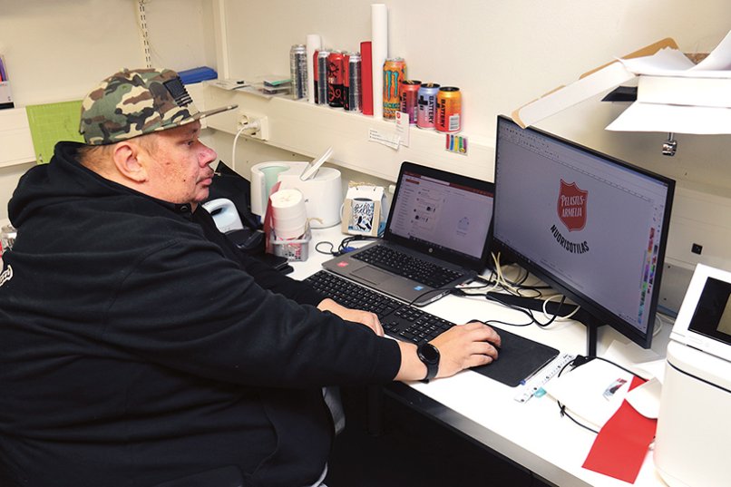 Alppikadun asumispalveluyksikön kellarikerroksessa toimii Pelastusarmeijan printtipaja. Hupparipinkkojen ja hyllyllä esillä olevien painatettujen mukien vieressä koneen ääressä istuu 39-vuotias Petri Myllynen. Hän on kulkenut pitkän tien kadulta printtipajan graafikoksi ja ohjaajaksi.