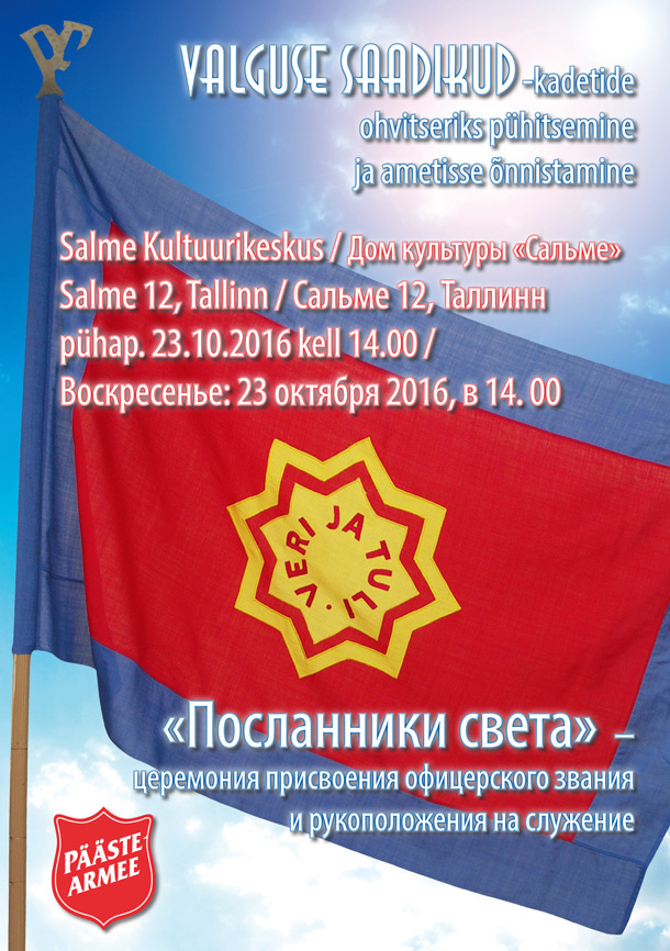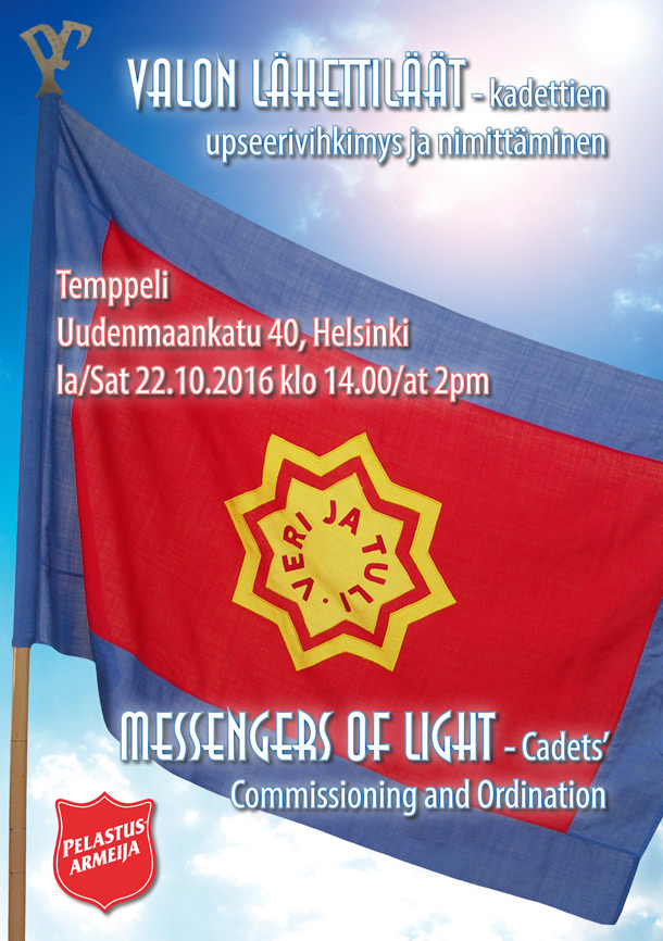 Kadetit Kaisu ja Riku Leino vihitään upseereiksi Temppelin osastossa, Helsingissä (Uudenmaankatu 40) lauantaina klo 14 ja kadetit Kirill Burunov ja Arina Danylova Koplin osastossa, Tallinnassa sunnuntaina klo 14. Tilaisuudet ovat kaikille avoimia.