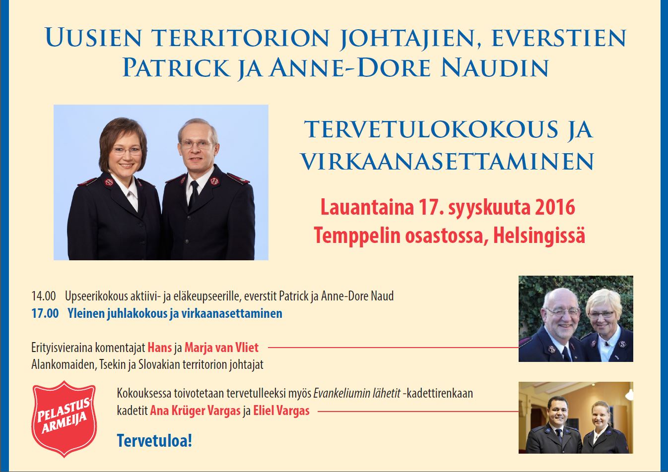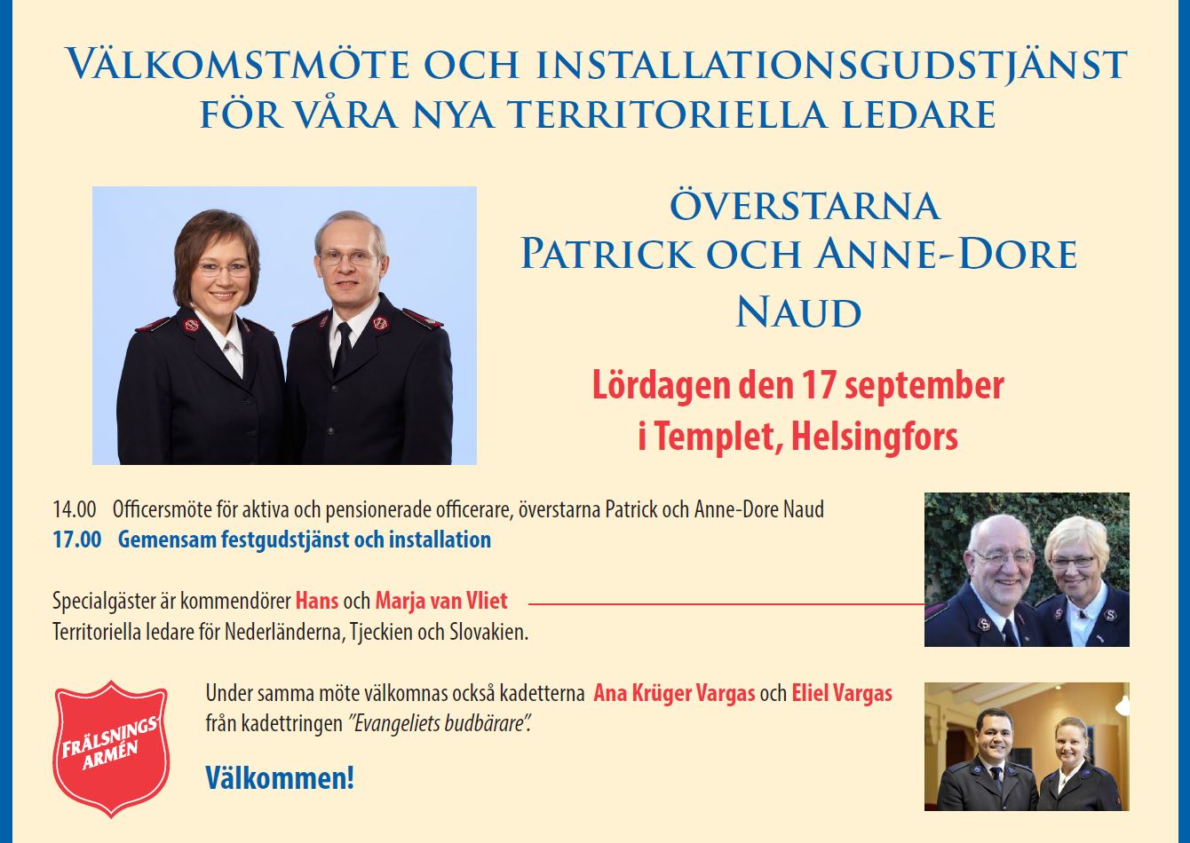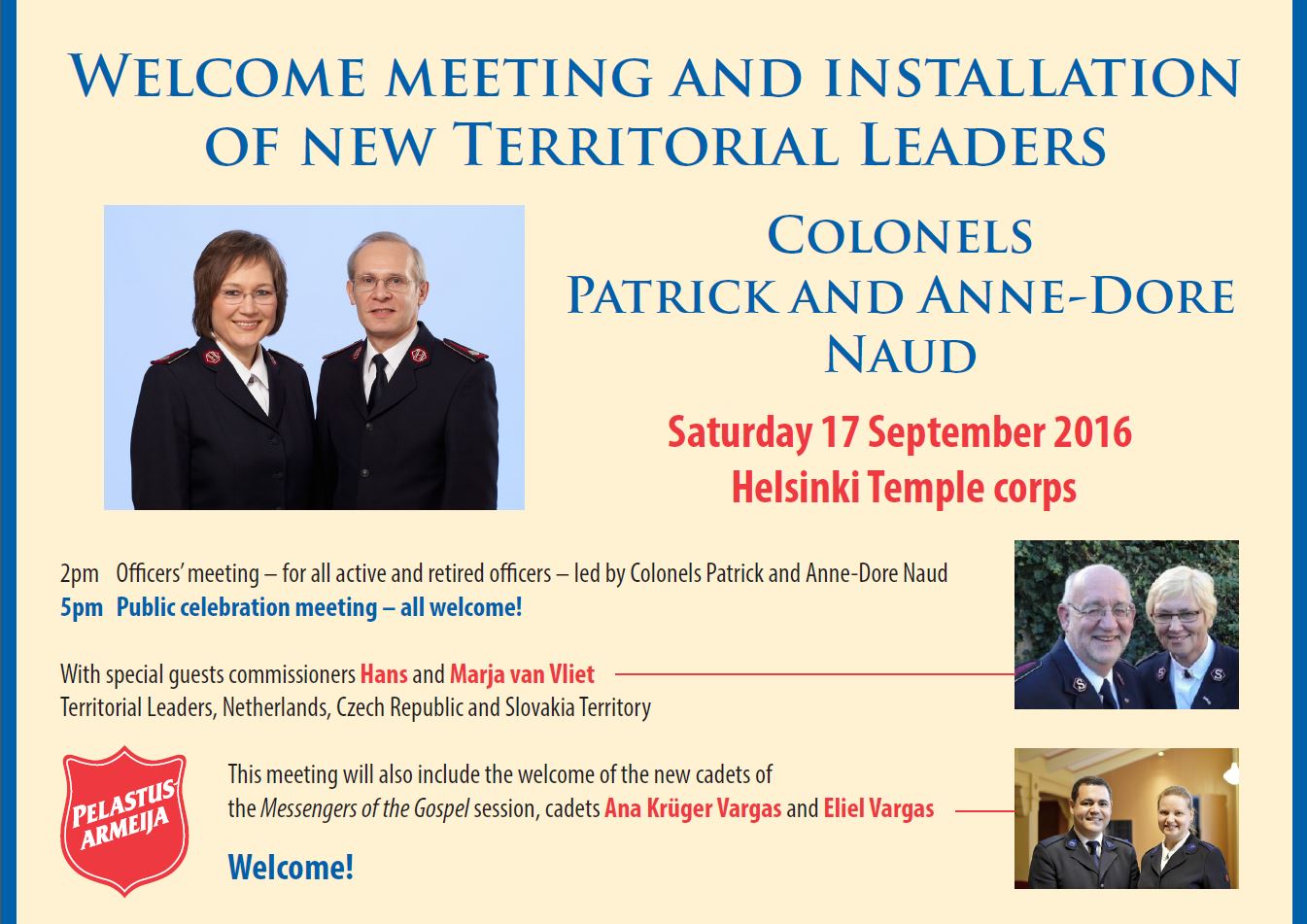 Erityisvieraina komentajat Hans ja Marja van Vliet Alankomaiden, Tsekin ja Slovakian territorion johtajat. Kokouksessa toivotetaan tervetulleeksi myös Evankeliumin lähetit -kadettirenkaan kadetit Ana Krüger Vargas ja Eliel Vargas.