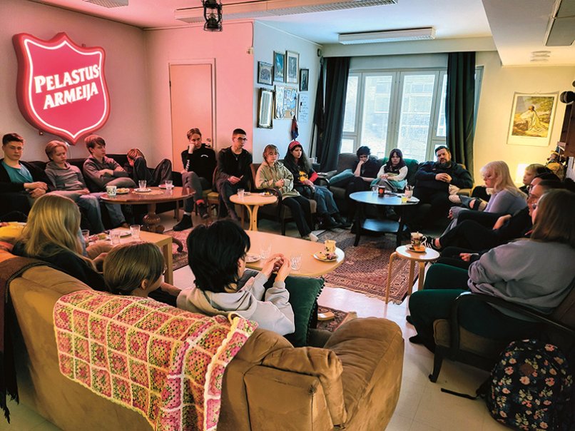 Kello on hiukan yli kuusi, ja viimeisetkin nuoret ovat tulleet paikalle. Huoneessa on mukava, hämyisä valaistus, jonka lähteenä on Pelastusarmeijan valokilpi. Nuoria on tänään paikalla 18, ja siihen päälle me muutamat aikuiset. Huoneen jokainen sohva on hyvässä käytössä.