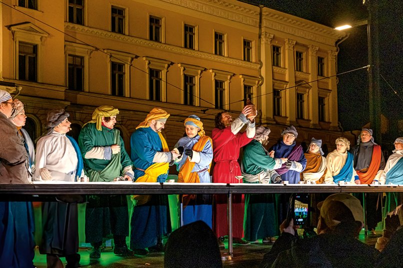– Näin johdatetaan yleisö messuun. Pidämme tästä Markun visiosta näytelmän lopetuksen suhteen. Siinä on hienoa symboliikkaa. Ennen näytelmää kerromme, että Tuomiokirkon lisäksi pääsiäisyön palvelukset järjestetään Uspenskin katedraalissa ja Pyhän Henrikin katedraalissa, joten näin myös ekumenia huomioidaan, Anna-Maija kertoo.