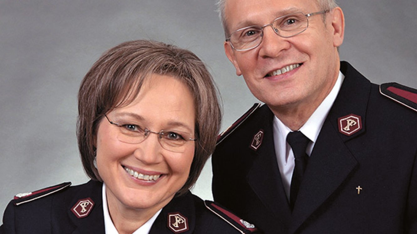 Kokouksen johtavat komentajat, kansainvälisen päämajan ohjelmatoiminna kansainväliset sihteerit Ted ja Debbie Horwood.