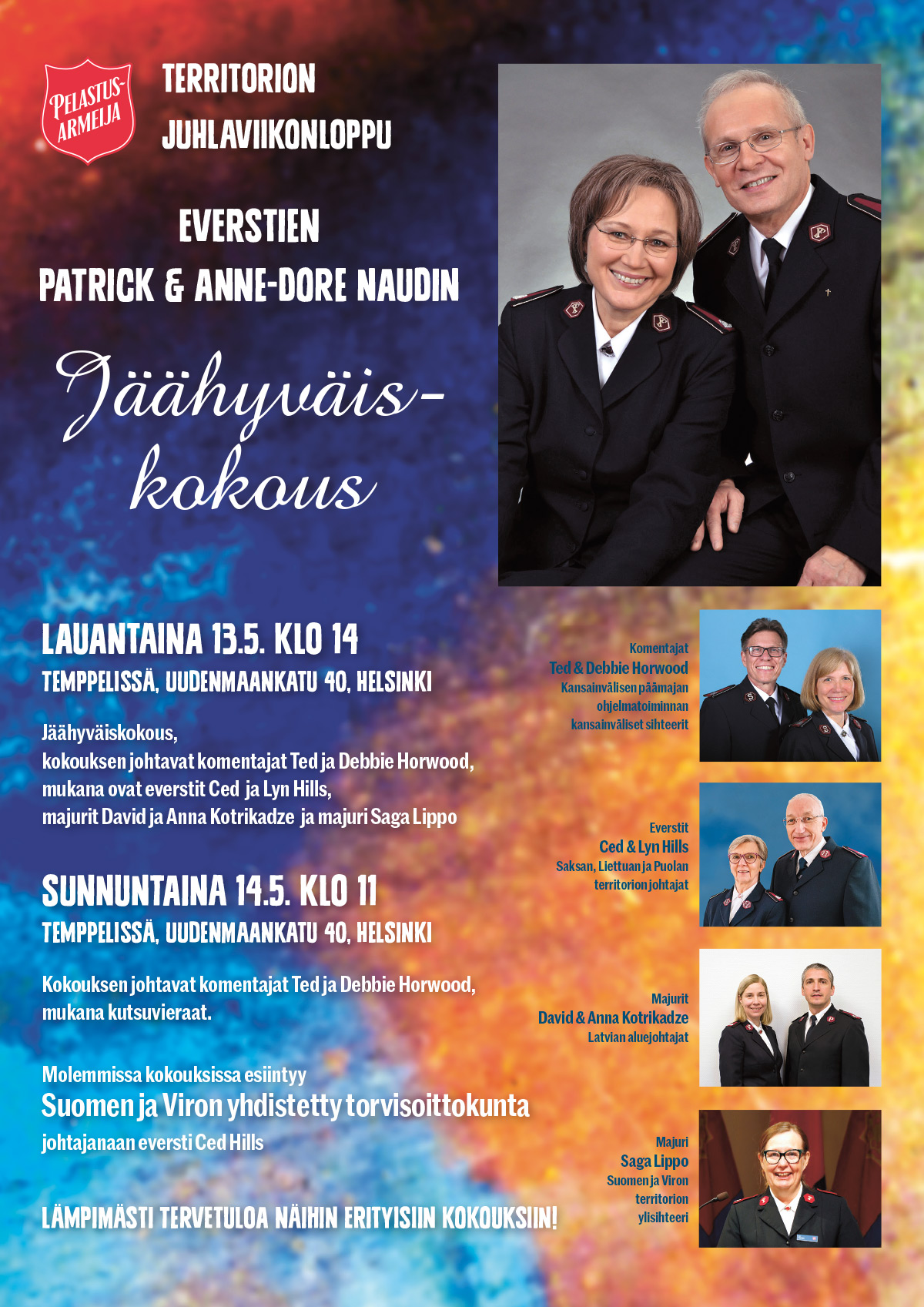 Helsingistä Muonioon, Kuopiosta Vaasaan – olemme oppineet paljon Suomesta. Myös Narvasta Tallinnaan, Tartoon ja Võruun – on ollut ilo oppia Virosta. Näiden kahden maan kulttuurit, historiat ja kansallisliput säilyvät muistoissamme. Samoin Pelastusarmeijan liput, jotka liehuvat monissa paikoissa, osastoissa ja sosiaalipalvelukeskuksissa, muistuttaen meitä vastuusta jatkaa missiotamme ihmiselämien ja sielujen pelastamiseksi.