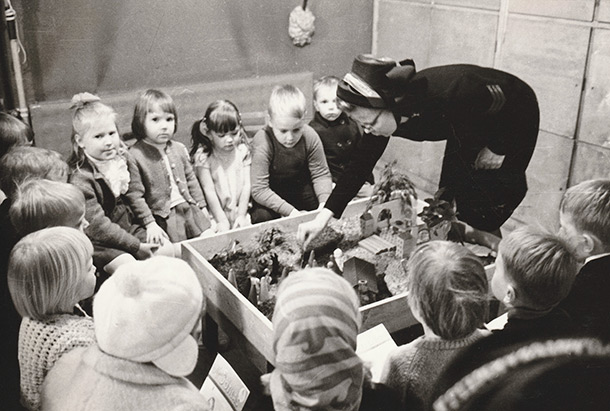 – Asuimme poliisilaitoksen läheisyydessä. Siellä oli paljon pieniä lapsia, ja toin heitä pyhäkouluun. Olin pyhäkoulussa hiekkalaatikkotädin apulainen. Yhtenä kertana täti sairastui. Tarinat olivat minulle tuttuja ja tiesin, missä tavarat olivat, niin yhdeksänvuotiaana pidin neljäkymmentäpäiselle hiekkalaatikkoryhmälle pyhäkoulutunnin. Jumalanpalveluksen loputtua osastonjohtajat menivät sotilashuoneen läpi asuntoonsa, niin olin aivan hiljaa. Kun he olivat menneet, jatkoin pikkuisille hiekkalaatikkotuntia, Gunnel muistelee hymyillen.