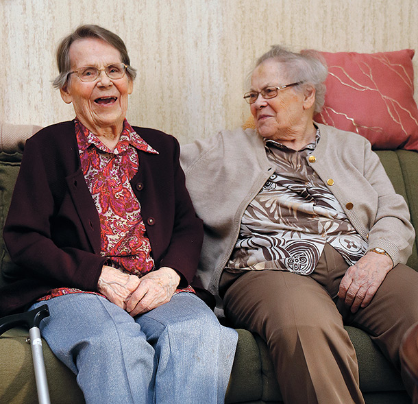 – Ennen koronaa otimme ahkerasti osaa jumalanpalveluksiin ja tiistaikerhoon. Nythän sitä taas saisi mennä, mutta jalkani on sen verran huonossa kunnossa, että olen arastellut lähteä, Terttu kertoo. – Nyt tekisi kyllä mieli. Ei se matka niin pitkä ole, tule sinäkin Terttu, Gunnel rohkaisee. – Ei se matka, vaan se istuminen, mikä tekee kipeää. Mene sinä vain, sillä välin minä voin heittää vaikka pitkäkseni, Terttu vastaa ja katsoo lämpimästi ystäväänsä silmiin.